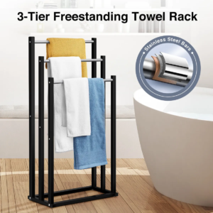 Enhance the functionality and style of your space with our 3-tier free standing towel rail, an optimal solution for streamlining the drying and storage of your towels. This towel rack is constructed from robust steel and finished with a rustproof coating, ensuring it stands up to the moist environment of bathrooms or laundry areas. The structure boasts three solid stainless steel bars capable of supporting a substantial load, in addition to adding a touch of elegance to your decor. Its thoughtful 3-layer design not only provides generous storage capacity but also promotes efficient air flow for accelerated towel drying. Stability and floor protection are paramount, which is why the base is outfitted with non-slip rubber pads that anchor the towel rail securely in place and safeguard your surfaces against unwanted marks. Whether it’s positioned in the bathroom, laundry room, or even a living area, our towel rack seamlessly adapts to your organizational demands.