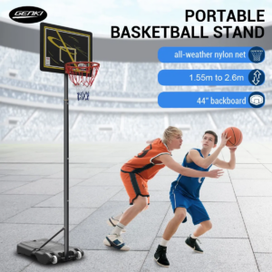 This adjustable basketball hoop, with a height range from 1.55m to 2.6m and smooth-rolling wheels, is perfect for all ages. Portable for indoor or outdoor use, it helps develop fitness, shooting skills, and teamwork through fun play with family and friends.