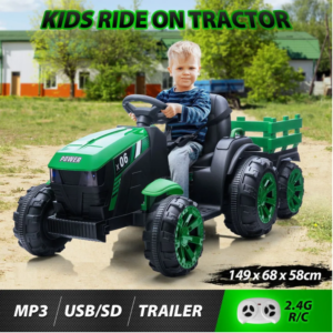 This electric ride-on tractor features a working trailer, LED lights, and music for realistic yard play. With two driving modes—child-operated or parent remote-controlled—and a 12V battery offering 50-60 minutes of fun, its open seat ensures easy access for endless outdoor adventures.