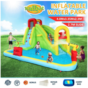 Beat the summer heat with this colourful inflatable water park! Made from durable, non-toxic Oxford fabric, its large size is perfect for multiple kids to safely jump and play. Includes accessories for extra fun and a storage bag for easy transport. Encourages active, developmental play all summer long.